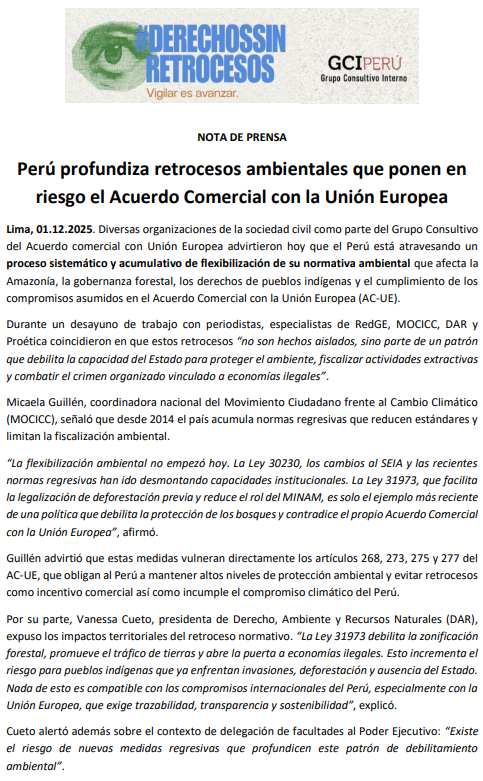 Una década de retrocesos. Desde 2014, una serie de normas aprobadas por el Congreso y promulgadas por el Ejecutivo, entre ellas el llamado Paquetazo Ambiental y la Ley 31973, señalada como una ley Antiforestal han debilitado la institucionalidad de protección del entorno en el país, advierten organizaciones parte del Grupo Consultivo del Acuerdo Comercial con la Unión Europea (AC-UE). Estos cambios contradicen el Acuerdo Comercial entre Perú y la UE y elevan el riesgo de tensiones comerciales, justo cuando Europa endurece sus controles y exige trazabilidad y productos libres de deforestación en las cadenas de suministro.